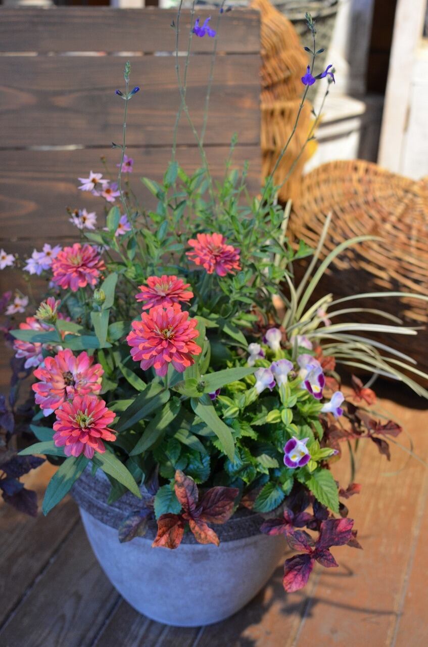 オータムピンクのジニアがポイントの寄せ植えです。青みのあるトレニアやチェリーセージが全体の雰囲気を引き締めます。落ち着きのある大人な雰囲気…でも可愛らしい。そんな素敵な方に送りたくなる寄せ植えです。【全長】H60×W30(cm)、【鉢】H22×φ25(cm)