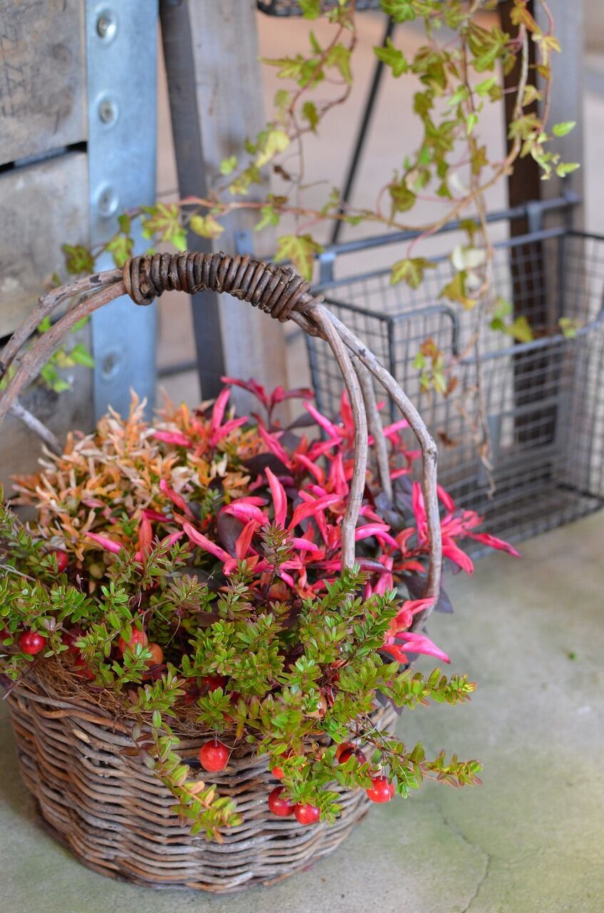 赤く染まったクランベリーがポイントの寄せ植えです。まるで摘み取った果実がバスケットからあふれ出ているような、ほっこりと可愛い雰囲気に仕上がっています。バックにあるビビットカラーのアキランサスがダークブラウンの籐カゴに生え、全体の雰囲気を格上げします。【全長】H32×W25(cm)、【籐カゴ】H11×φ20(cm)※取手部分は含まない