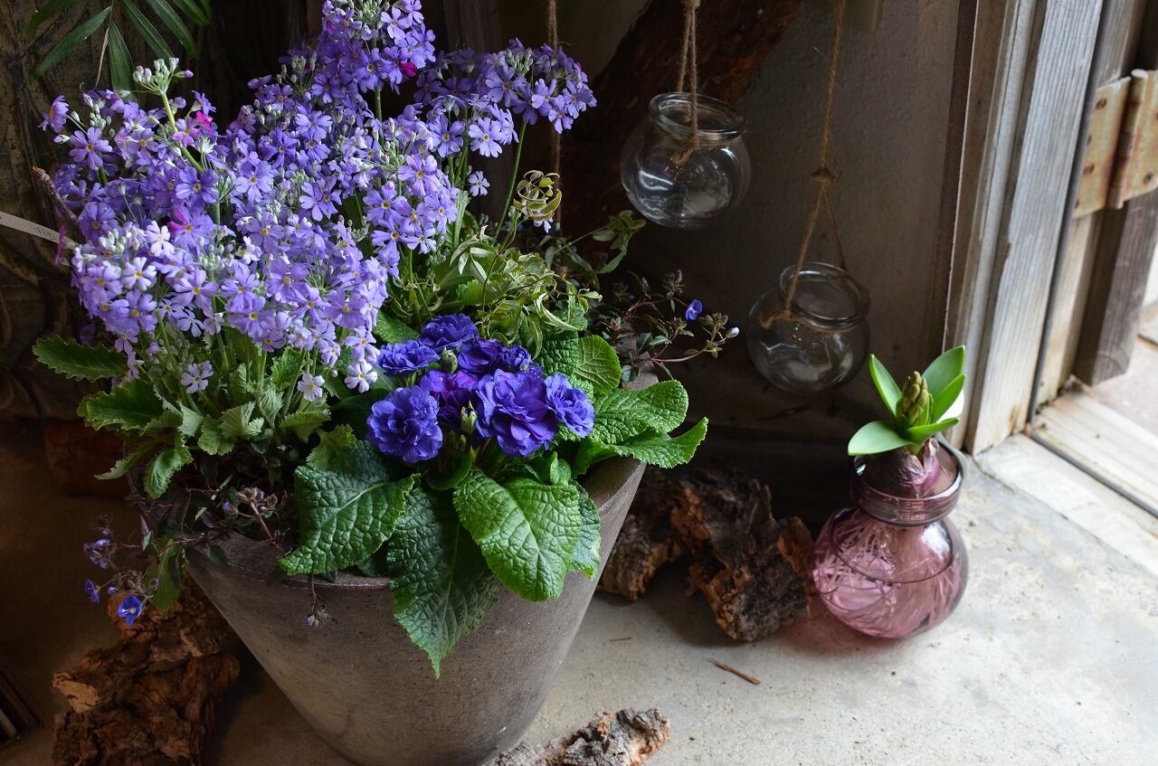 濃いパープルのプリムラ ベラリーナが主役の寄せ植えです。ベラリーナが持つ深い紫が凛として美しく、淡いパープルのプリムラ マラコイデス「湖畔の夢」、カラーリーフがその美しさを引き立てます。落ち着きのあるエレガントな寄せ植えで春を感じてみてはいかがでしょうか。【全長】H43×W30(cm)、【陶器鉢】H23×φ27(cm)